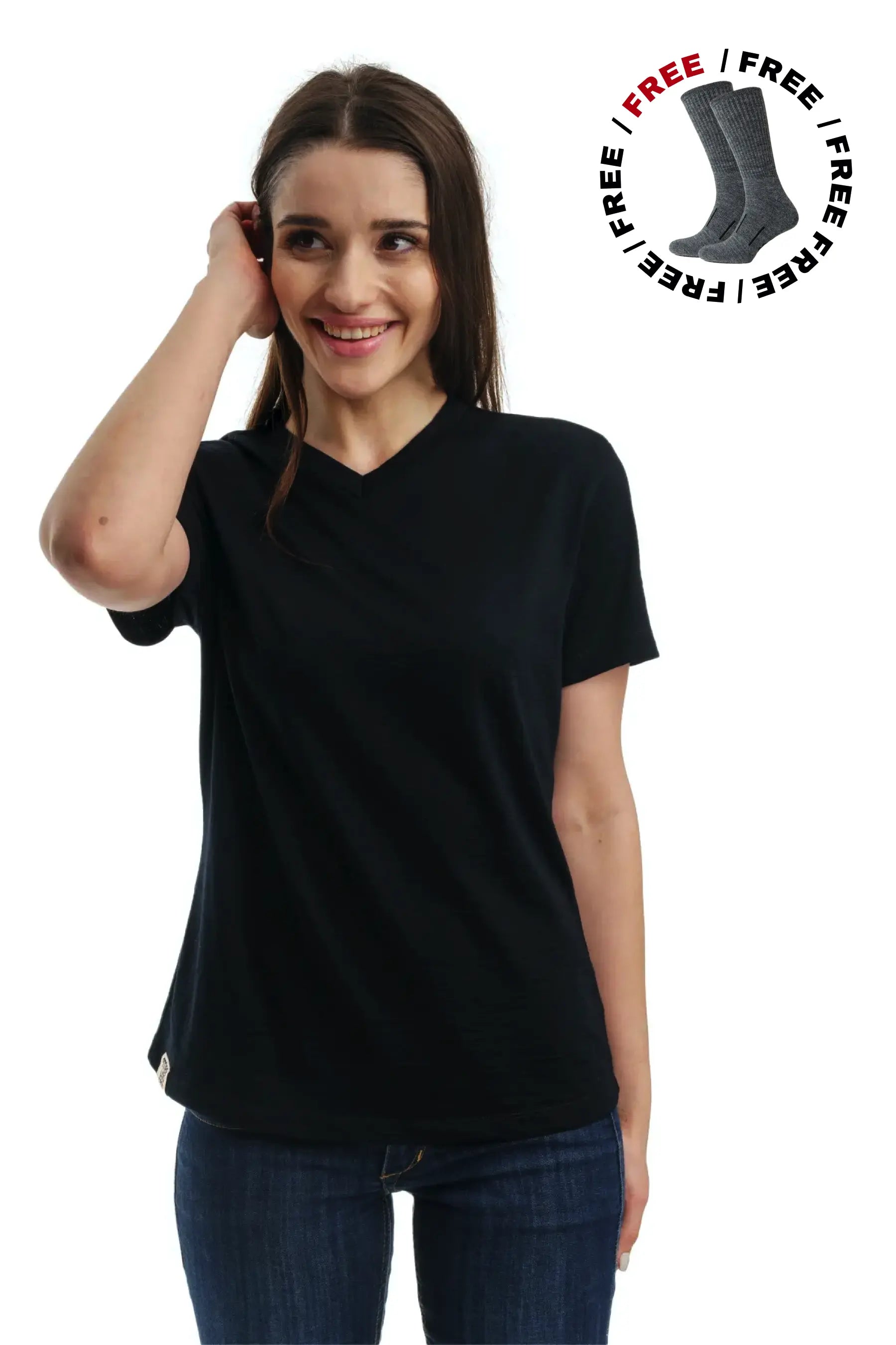 Damen Merino T-Shirt 165 Schwarz | V-Ausschnitt (+Socken)